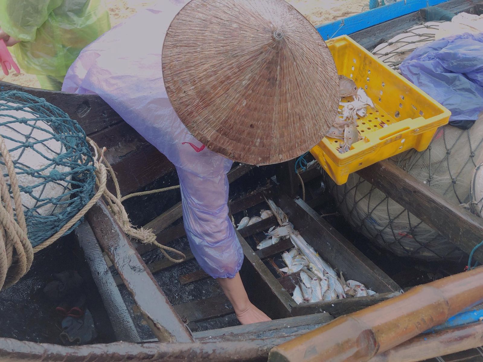 Hơn 3 giờ đồng hồ lăn lộn với những đợt sóng lớn vần vũ, trời mưa không ngớt, những chiếc ghe đầu tiên bắt đầu cập bờ với những mớ cá tươi rói, tôm còn nhảy đành đạch.