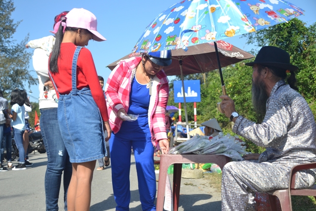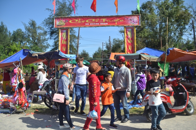 Giống chợ phiên Gia Lạc, chợ phiên truyền thống ở Quảng Ngạn (Quảng Điền) năm nay cũng hút khách từ sớm. Tờ mờ sáng, những quầy hàng bán đồ chơi trẻ em, các rổ rau, mớ tôm cá… đã sẵn sàng chờ đón khách thập phương. Khoảng 7 giờ sáng, người dân ở các xã lân cận: Phong Hải, Điền Hải (Phong Điền), Quảng Công (Quảng Điền), Hải Dương (Hương Trà) có mặt tại đây để tạo nên sự sôi động cho ngôi chợ chỉ đông trong 3 ngày Tết này. Năm nay, tuy mặt hàng hải sản thưa thớt hơn năm trước nhưng nông sản, đặc biệt các loại rau lại “lên ngôi”. Mới đầu phiên chợ, các rổ rau đã được bán sạch. Tâm lý chung, ai cũng muốn mua những bó rau xanh non về nhà ngày đầu năm. “Xưa bày nay làm, dường như đi chợ phiên là một công việc đầu năm của nhiều người dân nơi tui ở”, bà Hồ Thị Thí, quê ở xã Quảng Công kể.