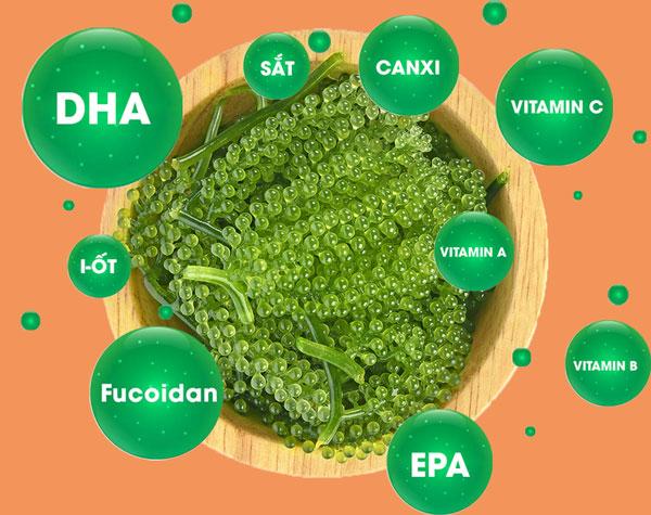 Ngoài ra, rong nho còn cung cấp DHA và EPA – đây chính là 2 loại axit béo nhóm Omega 3. Như chúng ta đã biết, DHA là dưỡng chất vô cùng cần thiết và quan trọng cho sự phát triển hệ thống thần kinh. Đặc biệt là đối phụ nữ mang thai. Còn EPA chính là tinh chất có tính lọc máu từ đó giúp làm giảm nguy cơ xơ vữa động mạch.
