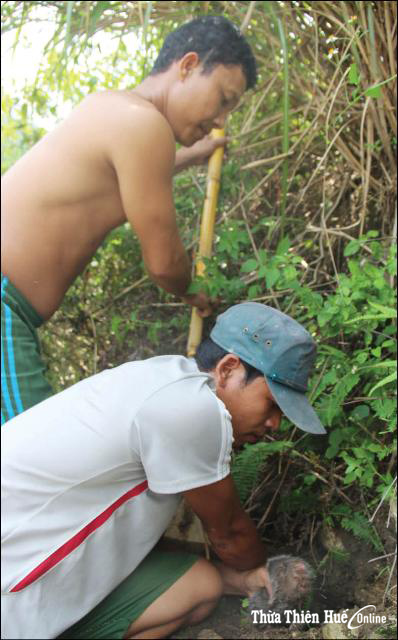 Sáng sớm, Nhíp chuẩn bị cuốc, xẻng cùng một chai nước bắt đầu hành trình tìm dúi. Cuốc bộ gần 1 tiếng đồng hồ, Nhíp dừng lại: “Dúi bữa ni hiếm, đi mãi không tìm thấy cũng mệt. Chừ chỉ đoán nơi dúi có thể xuất hiện thôi”. Dưới khóm lồ ô, bụi lau lách đót bị úa vàng, Nhíp nói.