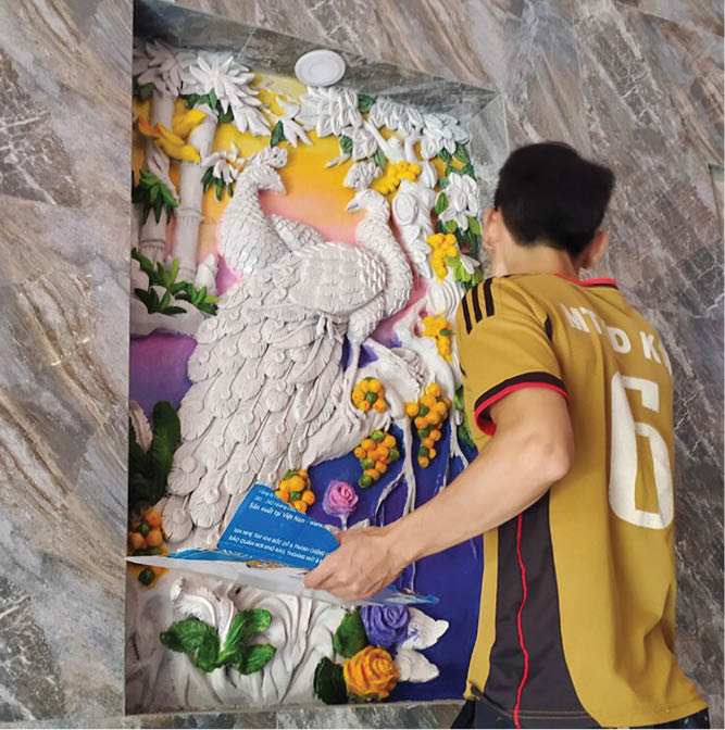 Ngoài phần gia công phức tạp, khác với những bức tranh tường, phù điêu đắp nổi còn tinh tế đến từng chi tiết. Lê Minh Hùng nói: “Bởi thế, đến cả ánh sáng bình minh hay hoàng hôn hắt vào phòng, chúng mình cũng phải tính toán cẩn thận. Chỉ khi nào phần bóng của phù điêu và bóng nắng hài hòa, lúc ấy phù điêu mới đạt hiệu ứng hình ảnh tốt nhất”.