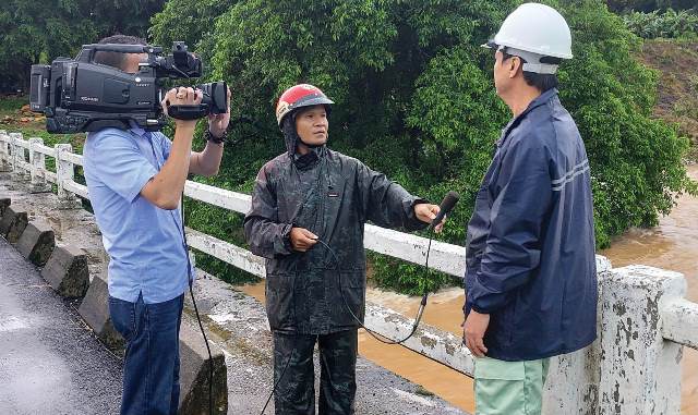 Phóng viên Đài Truyền thanh - Truyền hình huyện Nam Đông tác nghiệp trong mưa lũ (Ảnh chụp trước thời điểm bùng phát dịch COVID-19)
