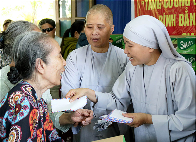 Các sư cô thuộc Ban Từ thiện Xã hội GHPGVN tỉnh tặng quà cho người mù tại thị xã Hương Thủy