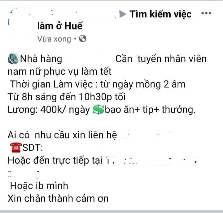 Một thông báo đăng trên mạng xã hội để tìm người làm dịp Tết ở Huế với mức lương 400.000 đồng/ngày