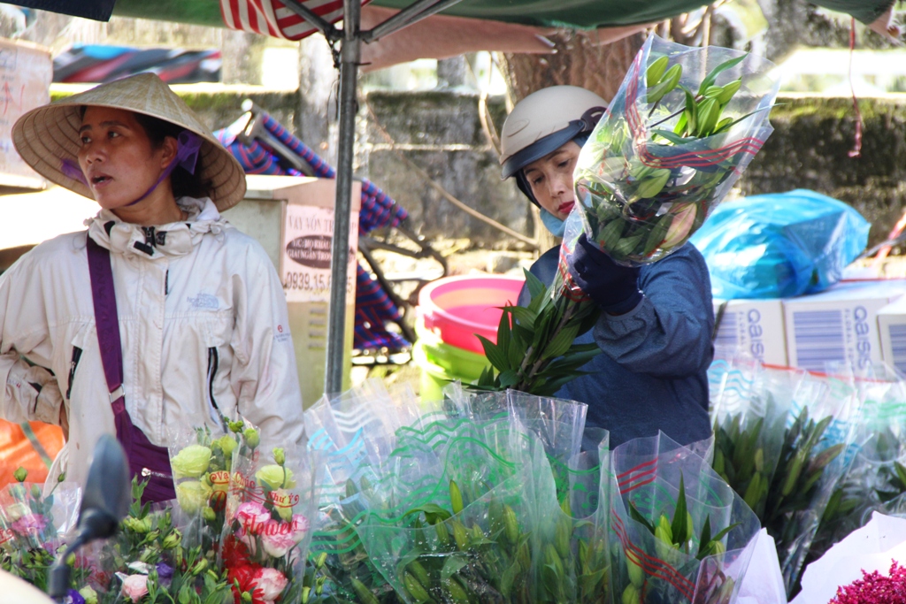 Sôi động không kém là thị trường hoa bó nhập từ Đà Lạt về với đủ chủng loại từ lay ơn, cúc, lyly… Mặt hàng này tập trung nhiều nhất ở các chợ như An Cựu, Bến Ngự… và nhiều nhất là ngay phía sau chợ Đông Ba.