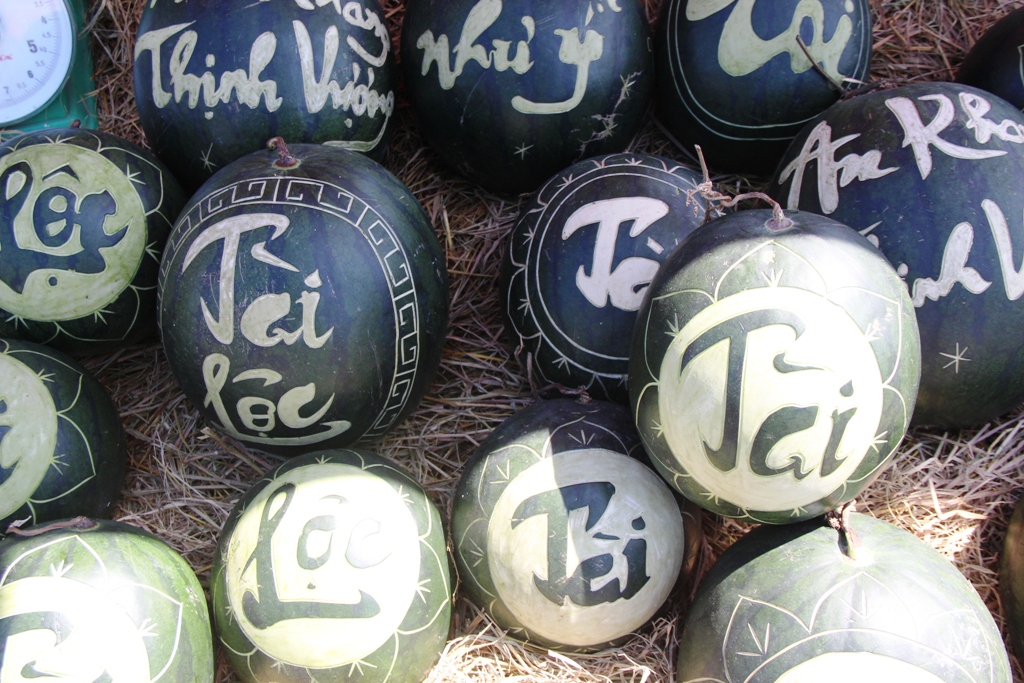 Cùng với hoa bó, một loại trái cây đặc trưng trở nên phổ biến những năm gần đây đó là dưa hấu. Loại trái này được người mua để ý bởi có thể khắc được hình con giáp, câu chúc… Dọc theo các tuyến đường ra vào cửa ngõ TP. Huế, dưa hấu được bày bán tràn lan, người mua tha hồ lựa chọn. Dưa hấu chủ yếu được nhập từ Gia Lai về.