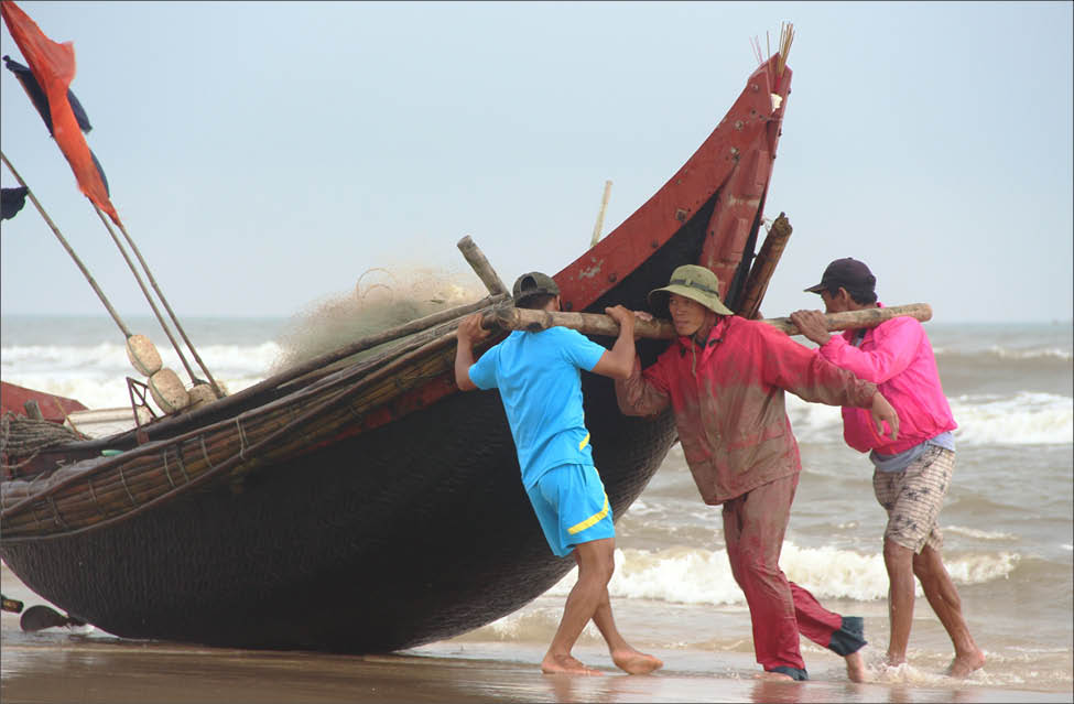 Đứng cạnh tôi bên bãi chông lăn tròn trên cát, lão ngư Nguyễn Công An (thôn Tân Mỹ, xã Quảng Ngạn) lâu lâu lại thở dài thành tiếng. Với con mắt gần nửa đời gắn bó với nghiệp ngư, ông dễ dàng nhận thấy màu nước biển biến đổi như thế nào. Nước xoay tròn, chuyển dòng chảy không theo một quy luật nào. Ông bảo đó là sự thay đổi khác lạ của biển so với độ mấy chục năm trước. “Chính sự thay đổi dòng chảy đó khiến cho cá tôm thay đổi, mà theo hướng ít đi”, ông An nói theo kinh nghiệm của mình rồi giải thích căn nguyên sự việc này. Rằng, biển bãi ngang, ngư dân chỉ đánh bắt vùng lộng (khoảng 20 hải lý trở vào), đánh bắt theo mùa cá và đặc dụng của ngư lưới cụ, nhưng khi thiên nhiên thay đổi nghĩa là vùng hoạt động của cá tôm cũng vì thế có sự chuyển dịch. “Tui ví dụ ri cho dễ hiểu: Con cá trích vào mùa thường bơi vào vùng lộng thành đàn, tùy theo dòng nước nó có thể bơi trên mặt nước. Theo kinh nghiệm, ngư dân có thể đoán định được và chọn “bủa đàn” hay “bủa nổi” nhưng bây giờ dòng chảy của nước thay đổi, ngư dân khó đoán được”, ông An chia sẻ. Sự thay đổi của biển như lời ông An nói, tôi ngầm hiểu đó là do sự tác động của biến đổi khí hậu.