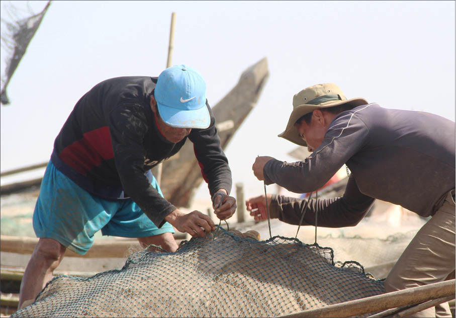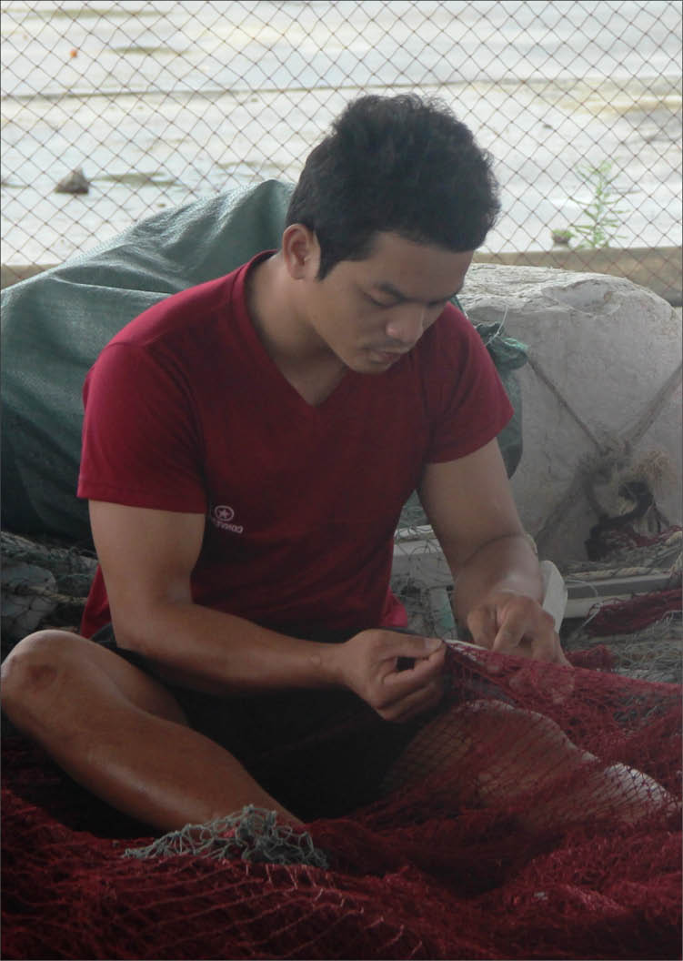 Ngư dân Vinh Hiền (Phú Lộc) sửa ngư lưới cụ trong kỳ nghỉ đông