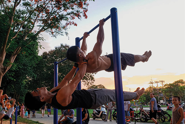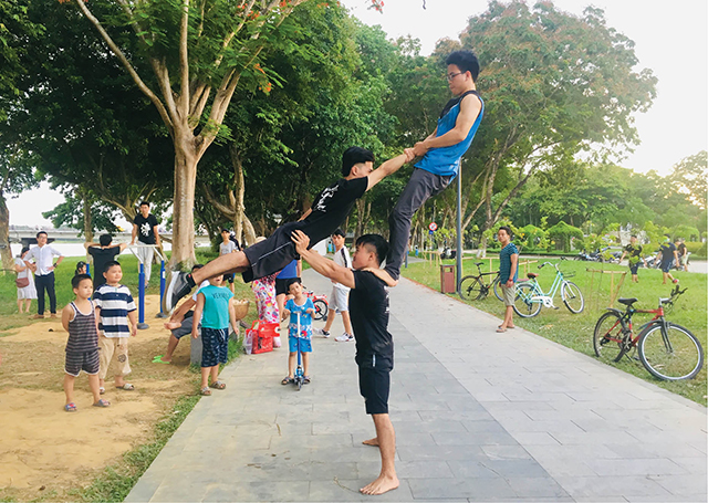 Cứ vào cuối tuần, những bạn trẻ của Nhóm DHYSW – Huế Street Workout lại có dịp tụ tập tại công viên bên bờ sông Hương. Mỗi thành viên đều mang những trang phục nhẹ, gọn, thoáng khí cùng với tinh thần vui vẻ, lạc quan. Khi nhạc được bật lên, song hành cùng giai điệu EDM (nhạc điện tử) được chọn lọc kỹ càng, bắt tai, những đôi tay rắn chắc, những gương mặt tràn đầy kiêu hãnh lại đắm mình cùng những động tác thể chất bắt mắt.