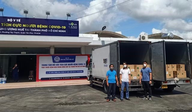 Đoàn công tác của Reckitt Việt Nam do anh Bình tổ chức đã đến Trung tâm Hồi sức COVID-19 Trung ương Huế ở TP.HCM để trao tặng dung dịch diệt khuẩn bề mặt và xà phòng rửa tay sát khuẩn thương hiệu Dettol.