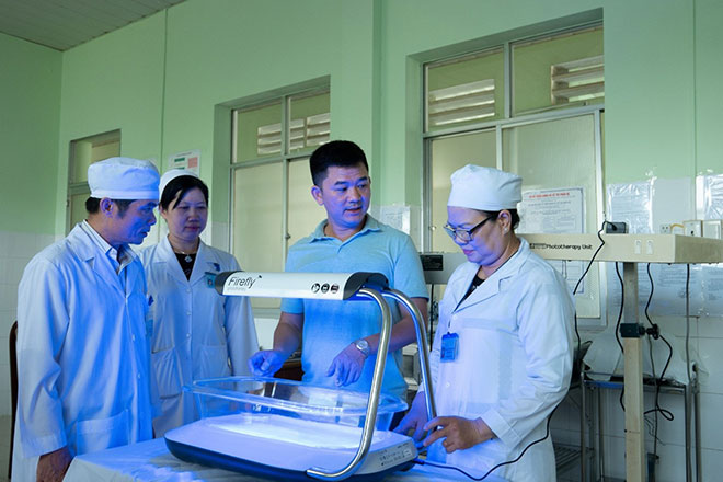 BS. Võ Văn Hiêm, Phó Giám đốc Bệnh viện Đa khoa Khu vực Hồng Ngự (trái) và các bác sĩ đang lắng nghe anh Nguyễn Thanh Bình giới thiệu về máy chiếu vàng da do Reckitt Việt Nam tài trợ.