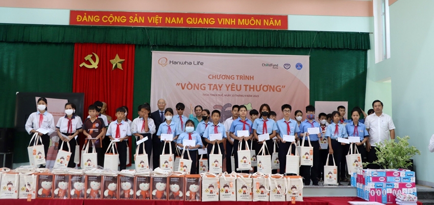 HNN.VN - Ngày 23/9, tại Trường THCS Phú Mỹ, Hội Bảo vệ quyền trẻ em Việt Nam phối hợp với các đơn vị tổ chức chương trình "Vòng tay yêu thương". Tham dự chương trình có bà Nguyễn Thị Thanh Hòa, nguyên Ủy viên TW Đảng, Nguyên Chủ tịch Hội Liên hiệp Phụ nữ Việt Nam, Chủ tịch Hội Bảo vệ quyền trẻ em Việt Nam; bà Nguyễn Thị Thúy Hòa, Nguyên Phó Chủ tịch UBND tỉnh Thừa Thiên Huế, Chủ tịch Hội Bảo vệ quyền trẻ em tỉnh Thừa Thiên Huế; ông Ngô Đình An Hải, Phó Tổng kinh doanh Miền Duyên Hải, Công ty TNHH Bảo hiểm Hanwha Life Việt Nam.