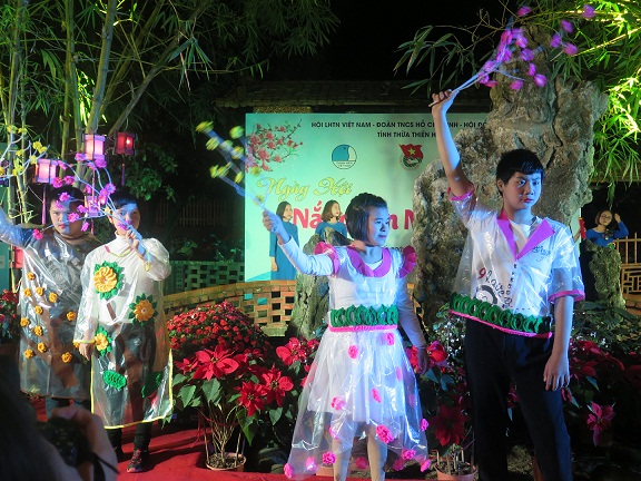 Với trang phục độc đáo được làm từ các loại hoa lá trong vườn trung tâm, em Đậu Thị Thuý Ngọc chia sẻ: “Được tham gia biểu diễn thời trang con rất vui. Con chỉ mong đến Tết để được tham gia những ngày hội như thế này”.