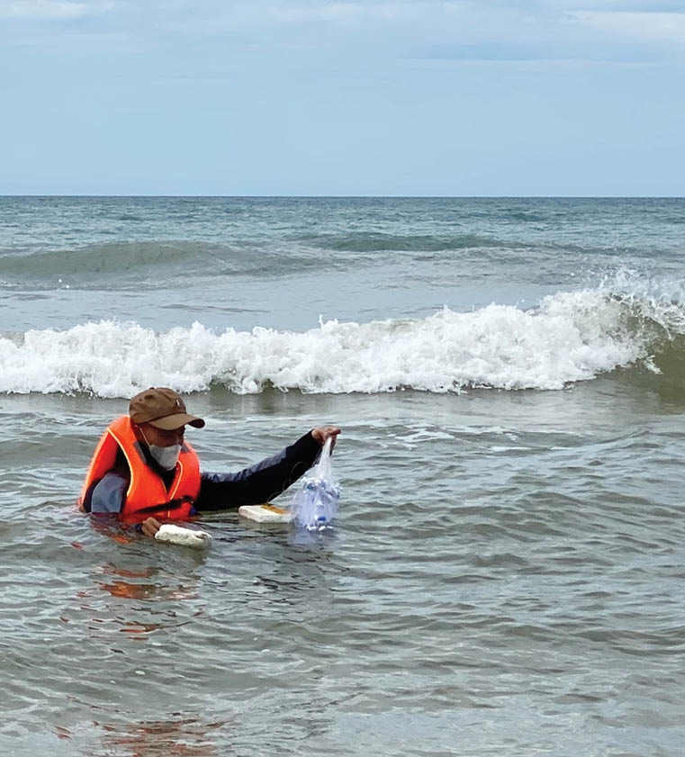 Vừa soạn sửa trang bị, anh vừa hài hước nói: “Dù thả lưới đã hơn 3 năm, nhưng tôi cũng chỉ là tay ngang mà thôi chứ chẳng phải là ngư dân “chính hiệu”. Cứ từ tháng 7 đến tháng 8 hàng năm, khi nước biển ngả màu vàng đục, không thấy rõ cát là lúc thích hợp cho những ai ưa thích hoạt động này. Đồ nghề của tôi bao gồm 2 tay lưới, một chiếc áo phao và… chính tôi. Sau khi đi dò ra khoảng cách phù hợp, nước sâu tầm ngang ngực, tôi sẽ rải lưới lần lần theo hướng vuông góc với bờ biển”.