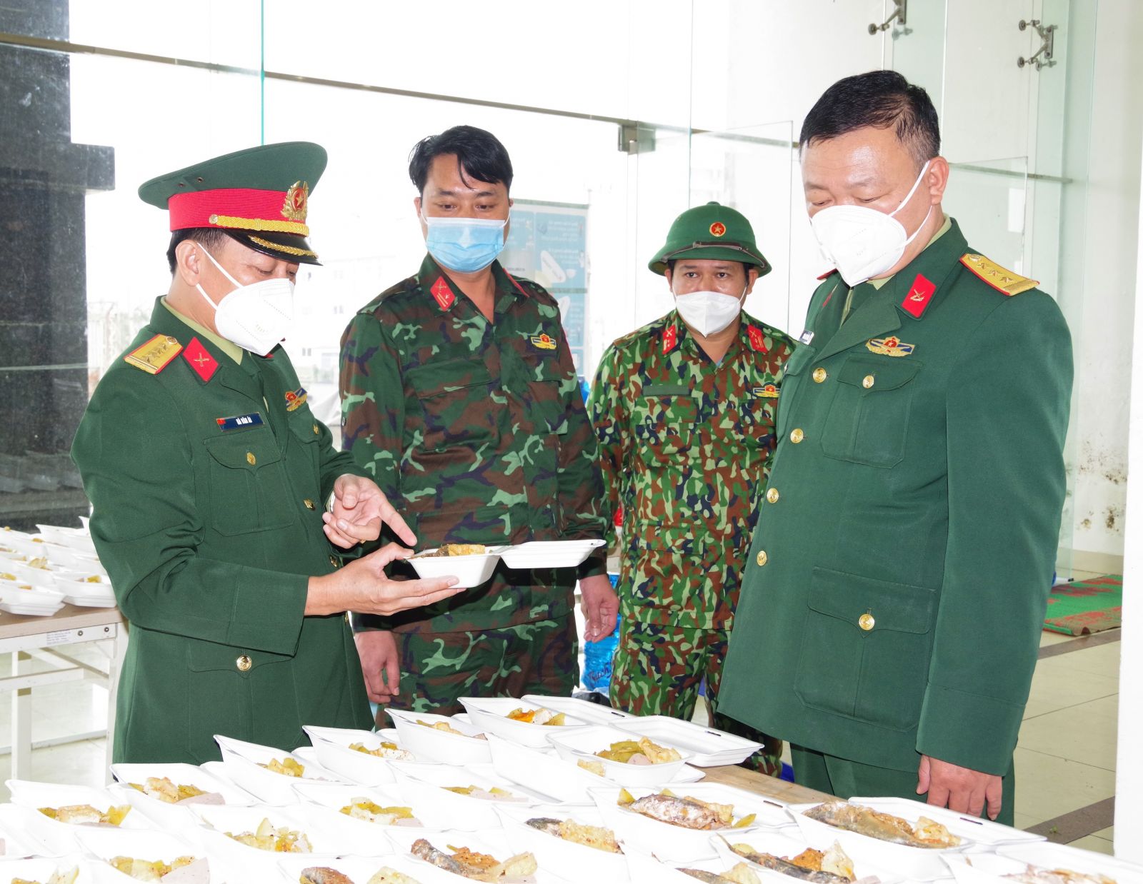 Đại tá Hà Văn Ái (ngoài cùng bên trái) kiểm tra chất lượng bữa ăn của bà con