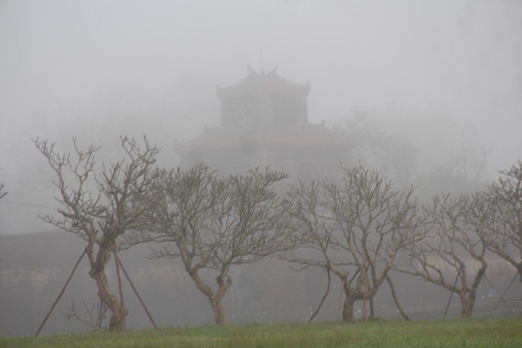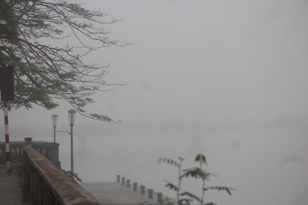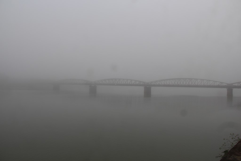 Cầu Trường Tiền nhìn từ đường đi bộ, tầm nhìn khá hạn chế bởi sương mù