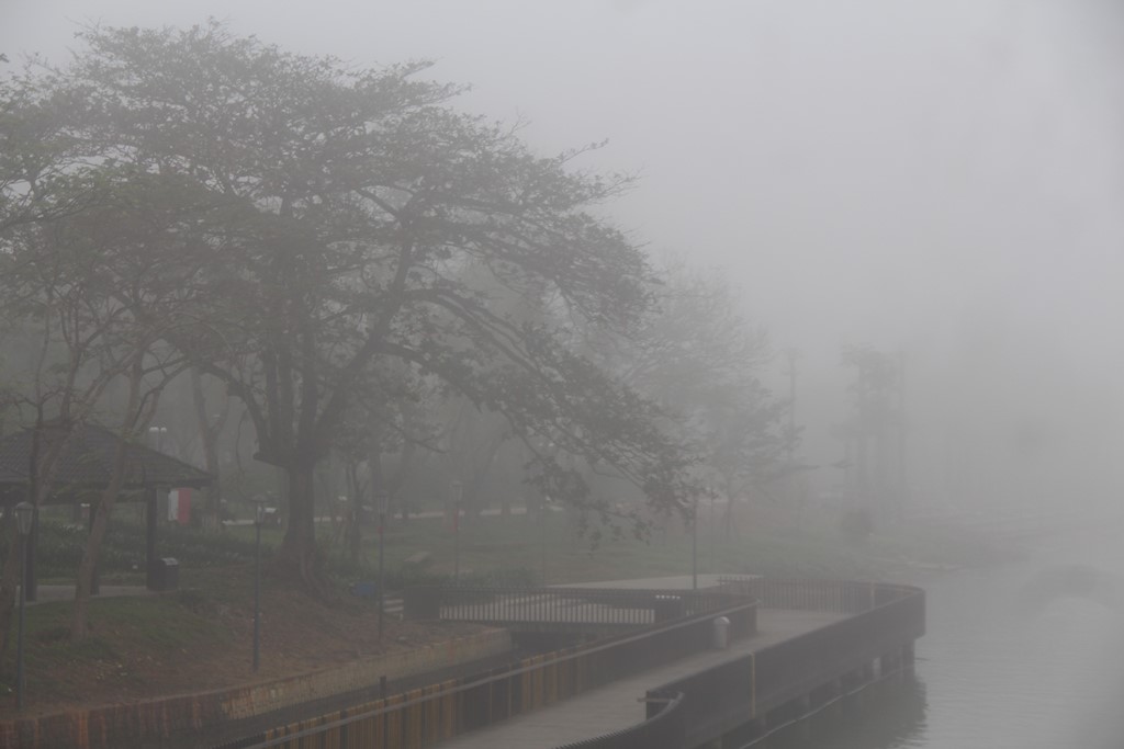 Đường đi bộ gỗm lim ẩn hiện trong sương