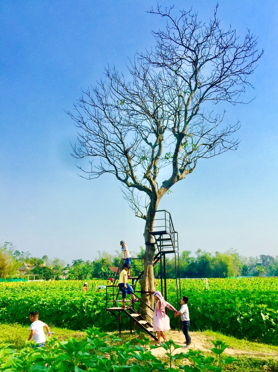 Cây "cô đơn" giữa bạt ngàn sắc vàng rực rỡ được anh Tám gắn thêm cầu thang để du khách có thể chiêm ngưỡng toàn bộ cánh đồng hoa