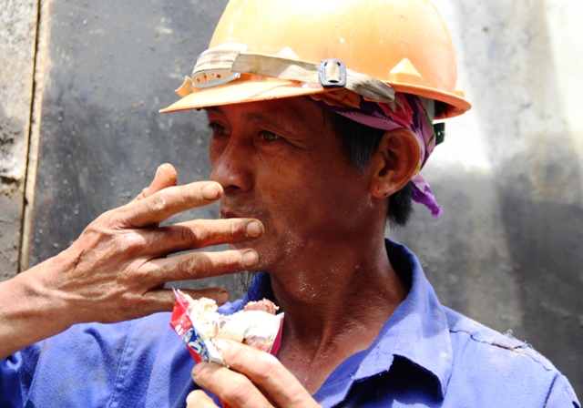 Tranh thủ ăn vội miếng bánh để lấy sức tiếp tục làm việc