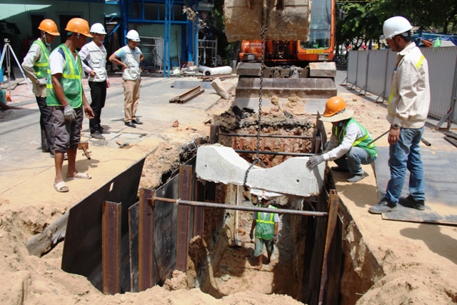 Nhiều công nhân tập trung điều chỉnh ống nước nhờ sức của xe cẩu để hạ xuống lòng đất, công việc này đỏi hỏi yếu tố nhịp nhàng, cẩn thận đến từng chi tiết