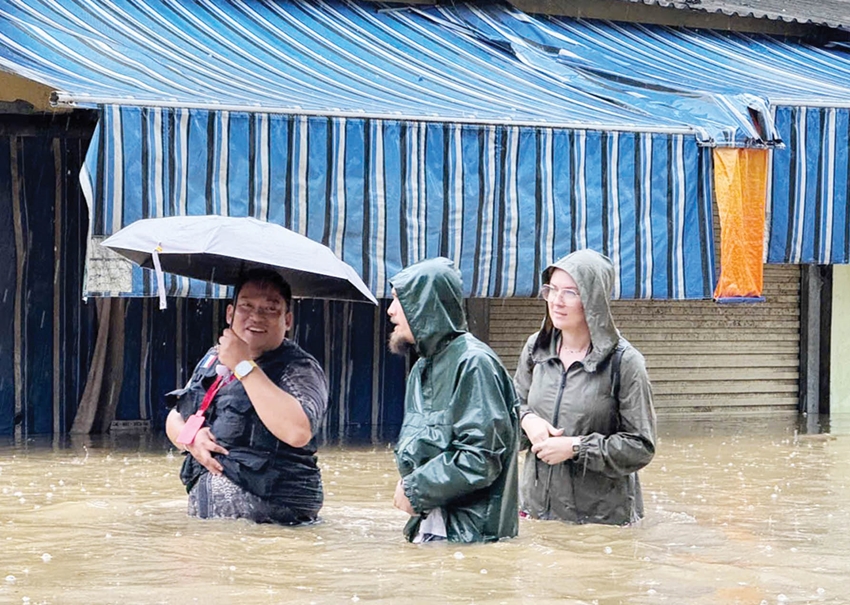 | Du khách nước ngoài trải nghiệm nước lụt ở đường Phó Đức Chính - Huế. Ảnh: Viết Đạt |