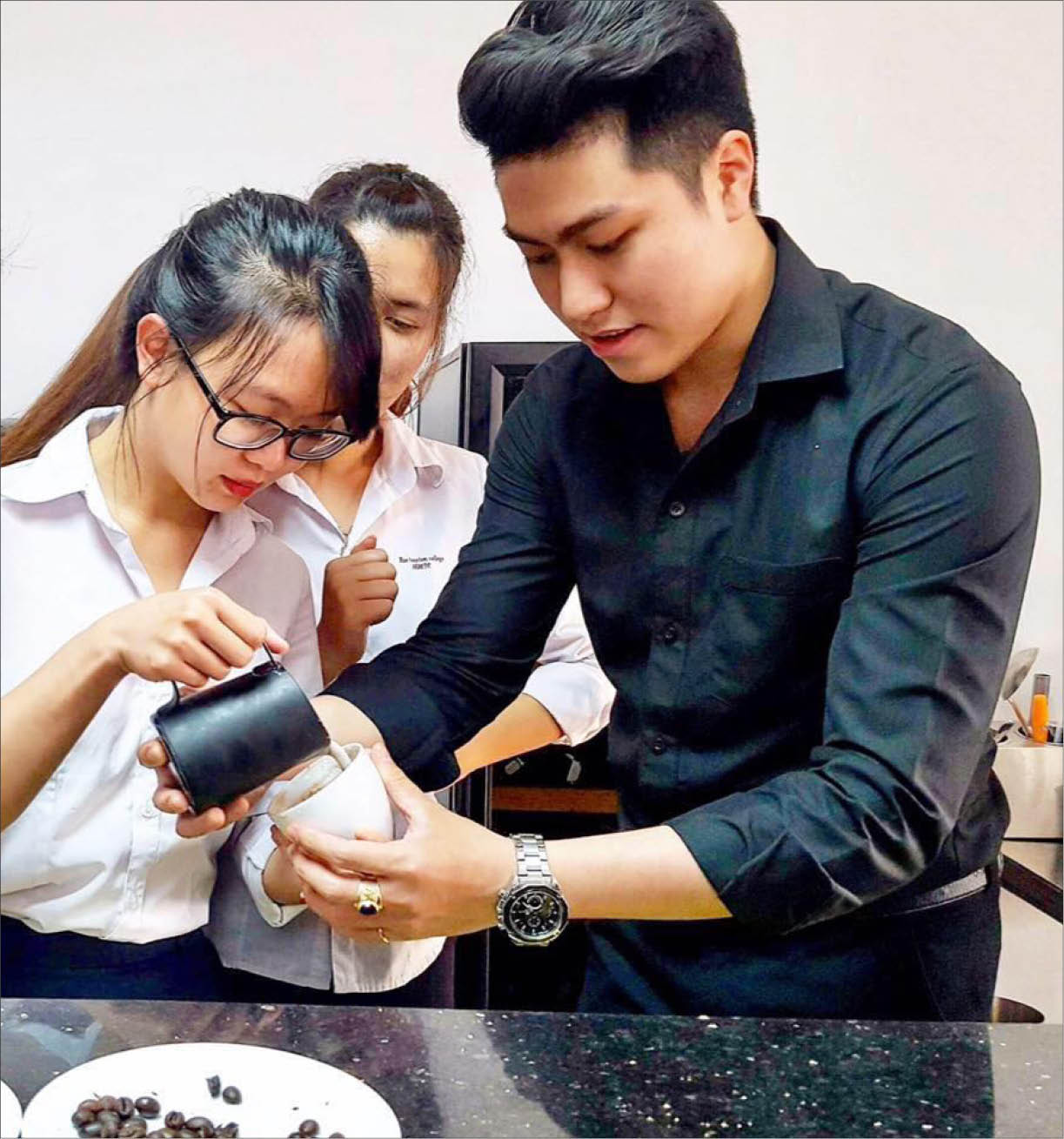 Công đoạn cuối là tạo hình. Nhìn chàng barista cẩn thận tắt quạt trước khi pha Latte-Art, chúng tôi mới hiểu phần nào về nghề của họ. Mỗi tách cà phê là cả một hành trình dài công việc, và sự tận tâm. Loáng trong chớp mắt, đôi cách thiên nga như bồng bềnh trên sóng bọt. Chúng tôi không hề biết rằng, chỉ là điều khiển dòng sữa trên lớp bọt latte, mỗi barista phải chọn lựa. “Nếu không được một tách cà phê đẹp, barista cũng sẽ không bao giờ có tách cà phê tàm tạm. Nó chỉ có thể là… xấu mà thôi”, Anh Tuấn khẳng định.
