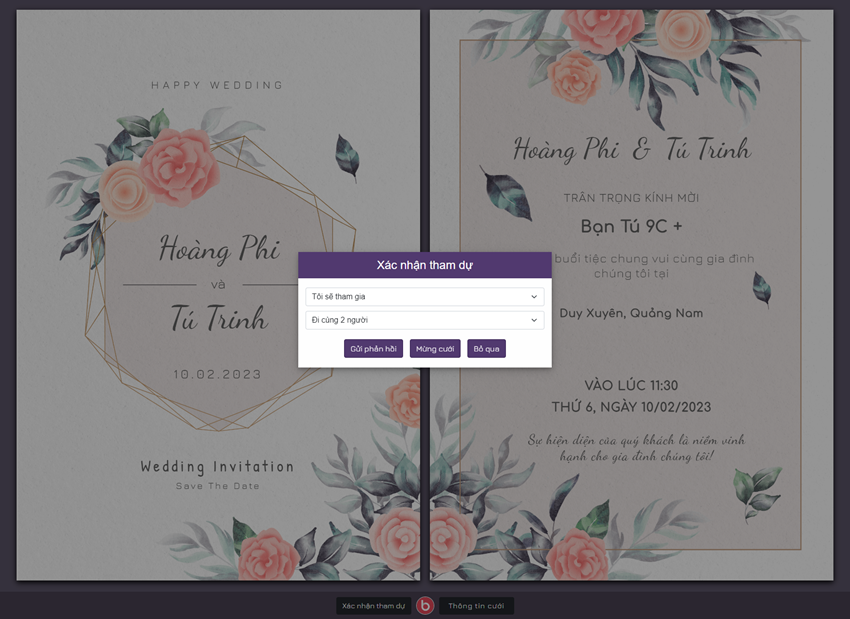 Việc gửi thiệp cưới và xác nhận tham gia cũng rất thuận tiện cho các khách mời. Khách mời chỉ cần truy cập vào đường link website để xem thông tin và xác nhận tham gia đám cưới.