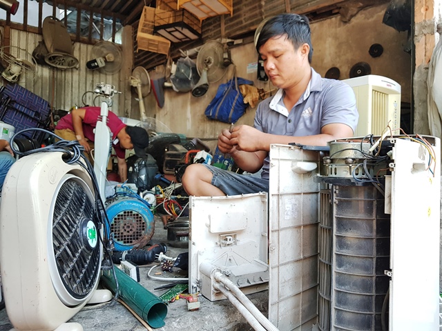 Anh Nguyễn Hùng đã có thâm niên hơn 10 năm làm nghề thợ sửa đồ điện tử nói chung và quạt máy nói riêng. Tưởng chừng cái nghề mà mọi người nghĩ rằng "lai rai" qua ngày và ít khi bận rộn, nhưng như lời anh Hùng, chừng vài năm trở lại đây, khi mùa hè nắng nóng cũng là lúc công việc dồn dập. “Đặc biệt năm nay và năm trước nắng nóng bất thường, bà con xài quạt máy hết công suất nên hay gặp sự cố hư hỏng”, anh Hùng nói và đó cũng là lí do mà nghề này đang... ăn nên làm ra.