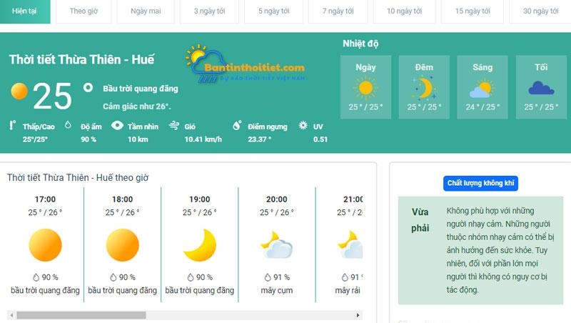 Hiện nay, có rất nhiều cách để xem dự báo thời tiết thông qua các trang thông tin trên mạng. Tuy nhiên, không phải địa chỉ nào cũng cung cấp bản tin đúng. Để có thể xem được Dự báo thời tiết Thừa Thiên Huế chính xác nhất, bạn có thể ghé ngay đến Bản Tin Thời Tiết.