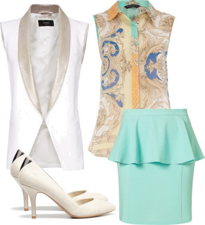 Vẫn là sơ-mi, vest, chân váy và giày kín mũi, song với những trang phục và phụ kiện này, bạn như một “cơn gió lạ” nơi công sở vốn rất ngột ngạt. Áo sơ-mi in họa tiết hoa văn nhã nhặn, chân váy peplum màu xanh pastel ngọt ngào và blazer phá cách. Nếu nơi bạn thực tập có quy định khá nghiêm ngặt về trang phục công sở, hãy chọn chiếc blazer khác có chiều dài cánh tay thích hợp.