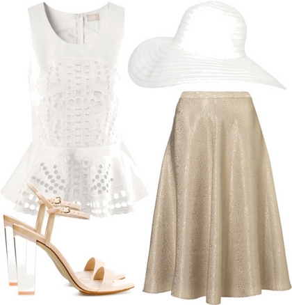 Váy midi dáng dài, chất liệu ánh kim thời thượng, kết hợp cùng áo peplum tôn dáng, với hoa văn đục lỗ tinh tế và đôi sandal có phần gót trong suốt.