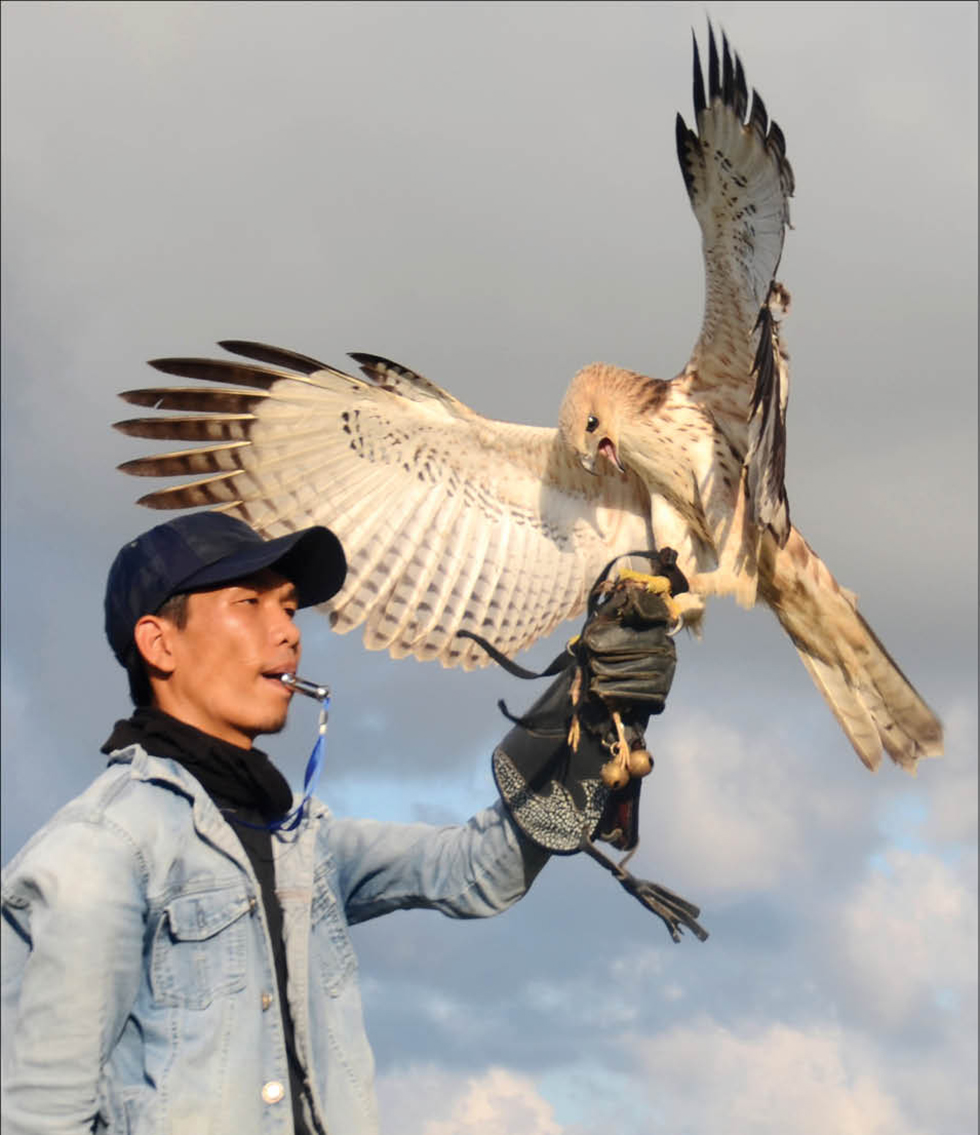 Ngay lúc này, Bùi Ngọc Điền, một thành viên trong nhóm vung mạnh tay cho chú đại bàng ưng bay ra xa hàng trăm mét. Tiếp đó, Điền dùng miếng thịt tươi đặt ở bao tay rồi thổi còi lệnh. Lập tức, chú đại bàng ưng quay ngoắt lại bằng tốc độ “tên lửa”, dùng đôi chân với những móng vuốt sắc nhọn dũng mãnh vồ lấy miếng mồi. Cứ tưởng sau khi vồ được, chú chim nhanh chóng xử lý chiến lợi phẩm. Nhưng không, miếng thịt vẫn được chú chim giữ chắc dưới chân, rồi nó hướng ánh mắt về phía người nuôi, gục gặc đầu như kiểu dò hỏi “có được ăn không?”...