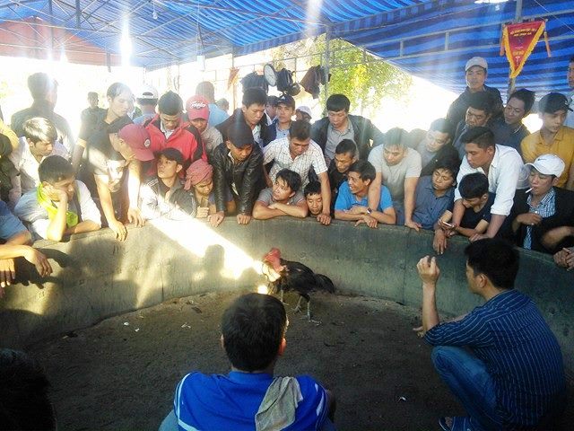 Cách khu bài chòi chừng 20 mét là hai “đấu trường” của những “vận động viên” gà chọi. Mỗi “đấu trường” đều đông nghẹt cánh mày râu vây quanh. Những chú gà to, khỏe, lưng dài, lông mượt lần lượt được mang ra thi đấu. Sau những thế đòn đẹp, các “cổ động viên” hét lên hào hứng.