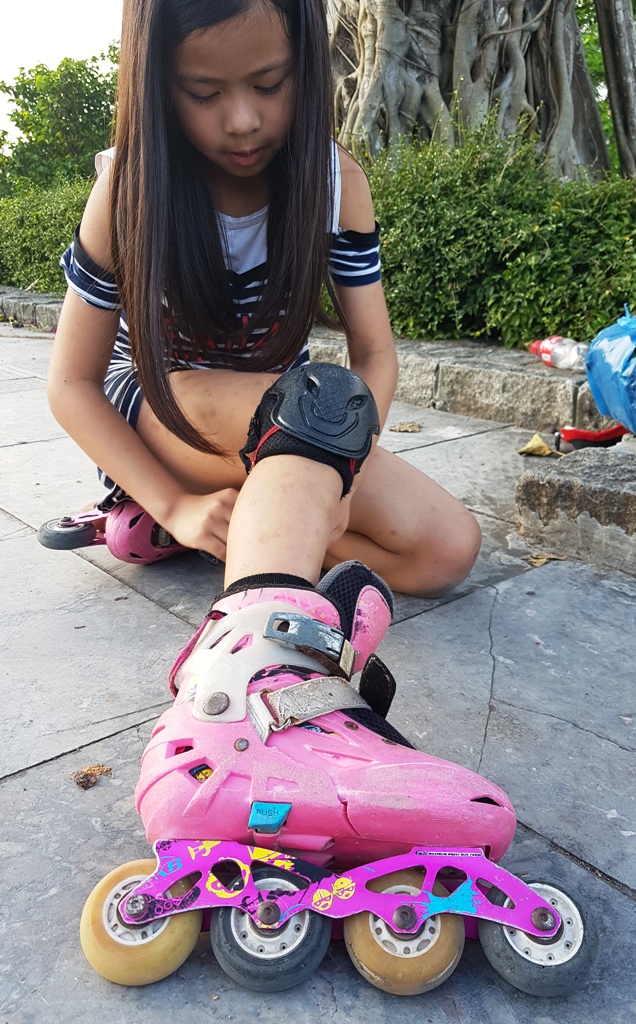Sau một hồi trượt, một em gái phải dừng lại để thắt lại đôi giày trượt sao cho chặt lấy chân