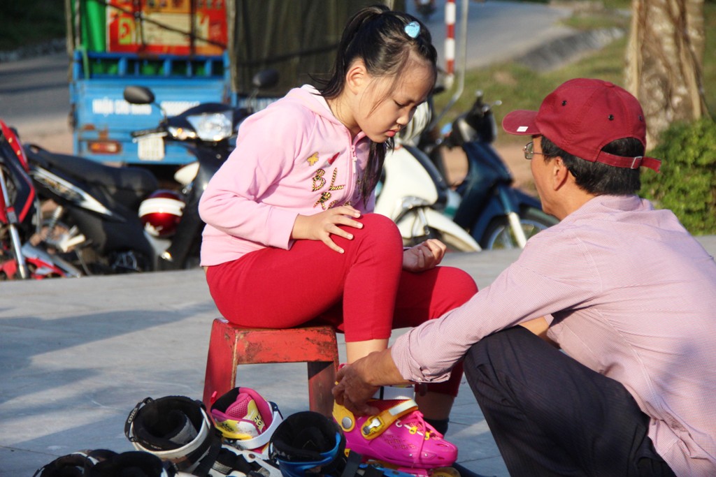 Một em nhỏ được phụ huynh đeo giày trượt vào trước khi ra sân. Ngoài những người trẻ, môn thể thao này thu hút nhiều em nhỏ
