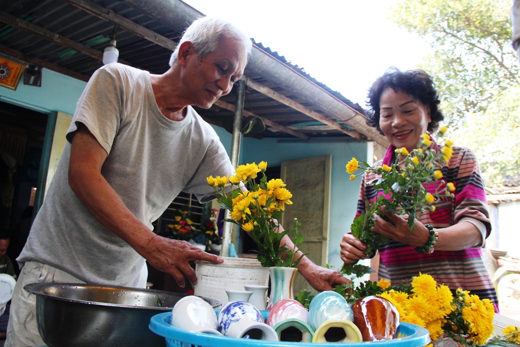 Vợ chồng ông Nguyễn Phước Liên Kiên và bà Hồ Thị Thương đang cùng nhau chuẩn bị những bình hoa để kịp đặt lên bàn thờ gia tiên trước giờ giao thừa. Hai ông bà kết hôn và sống ở thượng thành đã gần 40 năm, con cháu giờ đây cũng đề huề. "Rồi đây nếu xa nơi đây chúng tôi sẽ rất nhớ!", bà Thương xúc động