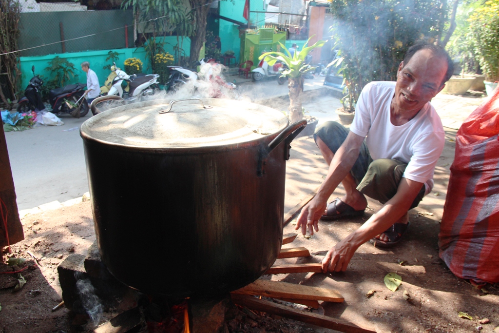 Cũng như nhiều dân Huế khác, anh Trương Trọng Công (48 tuổi) đang chăm chút bên bếp lửa canh cho nồi bánh tét kịp chín để đặt lên bàn thờ cúng ông bà, chờ đón năm mới