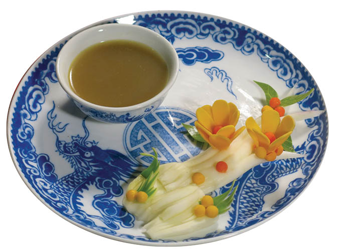 Anh Quang nhấn mạnh, nếu không thấy, nhiều người sẽ không tin và cho rằng “làm màu” cho sang. Nhưng, thực tế nếu không có thời gian thì không làm được. Hầu hết các món ăn đều là vị thuốc nên gia vị phải qua quá trình điều chế nhiều công đoạn, cần chừng đó thời gian, muốn nhanh cũng chịu. Một chén nước chấm nhỏ dùng cho món bào ngư, tôi làm mất 4 - 5 ngày, bởi mỗi thứ gia vị làm một cách riêng, sau đó phối lại với nhau.
