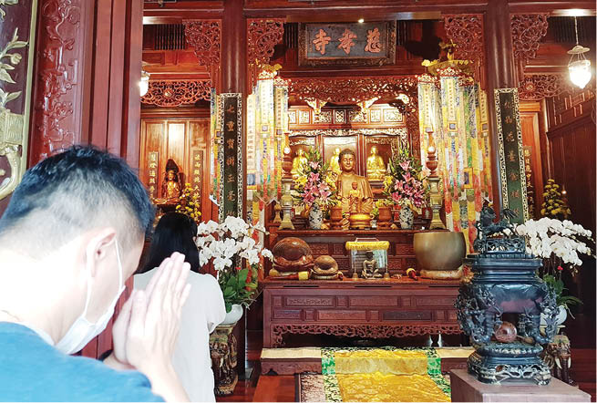 Người dân hành lễ ở bên ngoài chánh điện ở một ngôi chùa xứ Huế