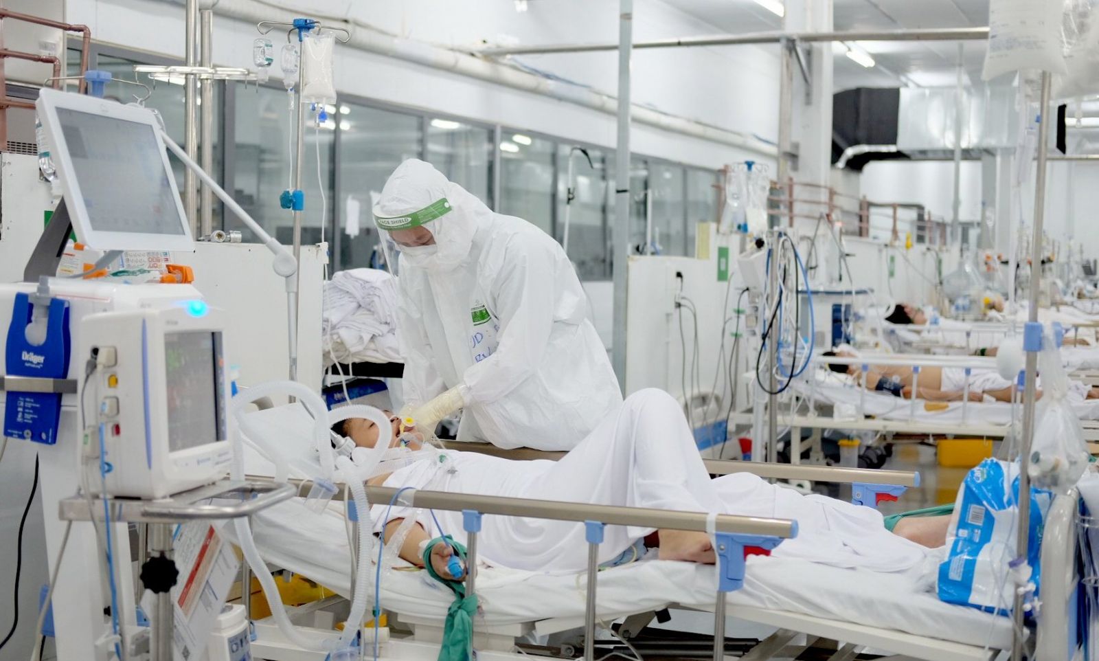Nhân viên y tế BVTW Huế chăm sóc bệnh nhân COVID-19 ở Trung tâm hồi sức tích cực trực thuộc BVTW Huế tại TP. Hồ Chí Minh. Ảnh Th. H