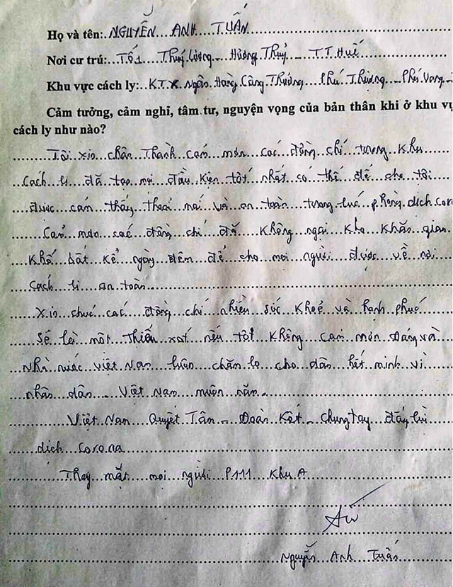“Ở khu cách ly, ngày ba bữa cơm, các đồ dùng vệ sinh cá nhân đều đầy đủ. Mỗi ngày, các anh chị đều thay đổi món ăn, đầy đủ chất dinh dưỡng. Các anh, chị đã vì nước quên thân, vì dân quên mình, chăm lo cho mọi công dân Việt Nam về nước cách ly. Các anh đã thức khuya, dậy sớm đón chúng tôi về khu cách ly một cách nhiệt tình, chu đáo. Rất cảm ơn các anh, chị! Chúc cán bộ chiến sĩ nhiều sức khỏe và bình an trong cuộc sống” - Dòng chữ nắn nót của chị Nguyễn Thị Nhung (xã Lộc Bổn, huyện Phú Lộc) được viết trên trang giấy gửi lại các chiến sĩ đang ngày đêm tận tụy cũng là cảm nghĩ của rất nhiều đồng bào Việt làm việc tại Lào thực hiện cách ly.