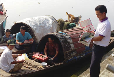 | Anh Nguyễn Hữu Nhi tham gia tuyên truyền dân số - KHHGĐ tại các khu chợ, bến đò ở địa phương |