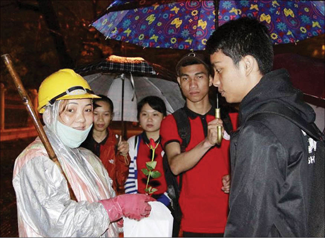 .Các bạn sinh viên tặng hoa cho phụ nữ nghèo nhân Ngày Quốc tế Phụ nữ 8/3 năm ngoái.Ảnh: ĐỘI CTXH TRƯỜNG ĐHKH HUẾ