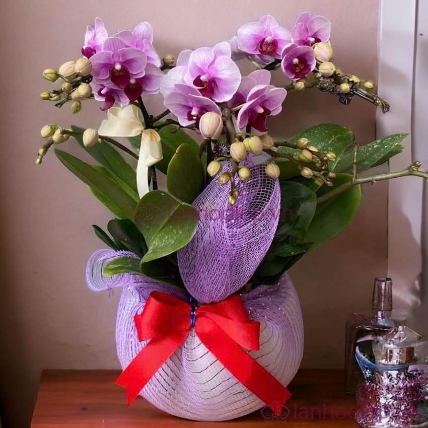 Để tạo nên nét chấm phá và khiến món quà tặng trở nên độc đáo hơn, bạn có thể chọn những chậu lan hồ điệp kết hợp với vải lưới cùng màu. Dù đây chỉ là một chi tiết nhỏ nhưng lại có giá trị thẩm mỹ rất lớn. Nữ giới luôn yêu thích cái đẹp. Việc chú trọng vào trang trí và nâng tầm vẻ đẹp cho chậu hoa sẽ phần nào giúp bạn thể hiện sự chu đáo, từ đó ghi điểm trong mắt các chị em.