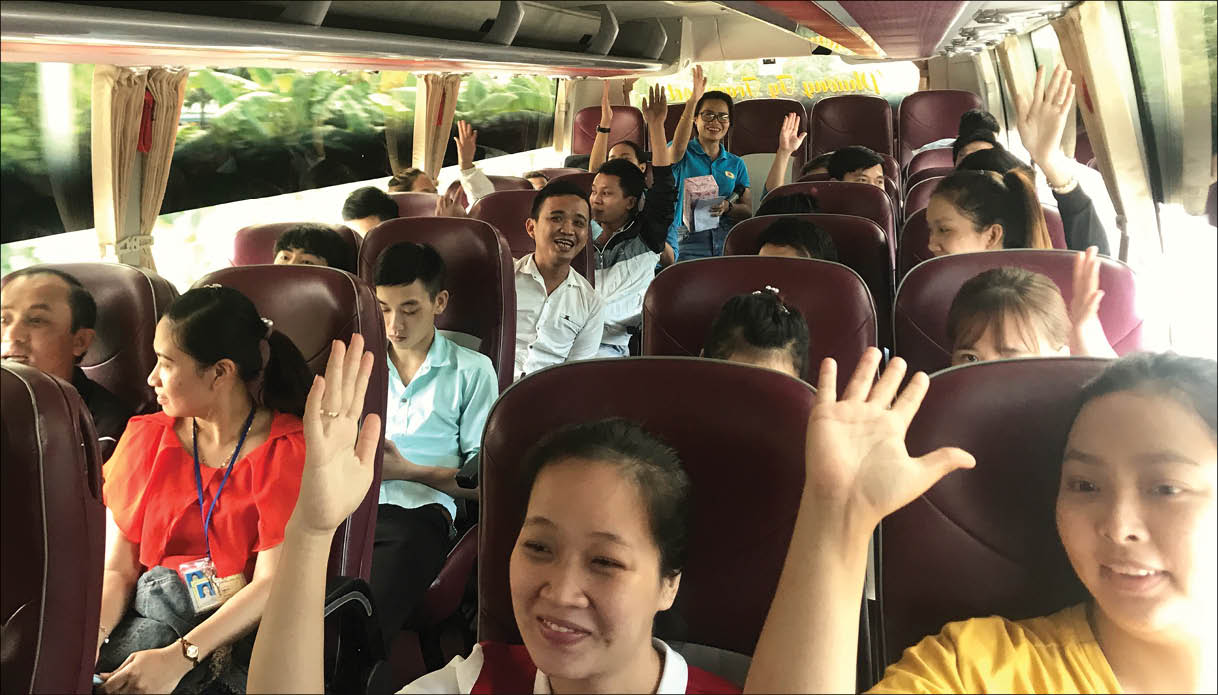 Chúng tôi tranh thủ trò chuyện với người đầu tiên lên xe là chị Lê Thị Tuyết Mai (25 tuổi). Chị Mai cho biết, tấm biển “Chuyến xe Công đoàn” đặt trước xe khiến chị mạnh dạn tham gia. Tổ chức Công đoàn thường xuyên có các hoạt động chăm lo đời sống cho công nhân lao động tại công ty, có lẽ chuyến xe này cũng không ngoại lệ.