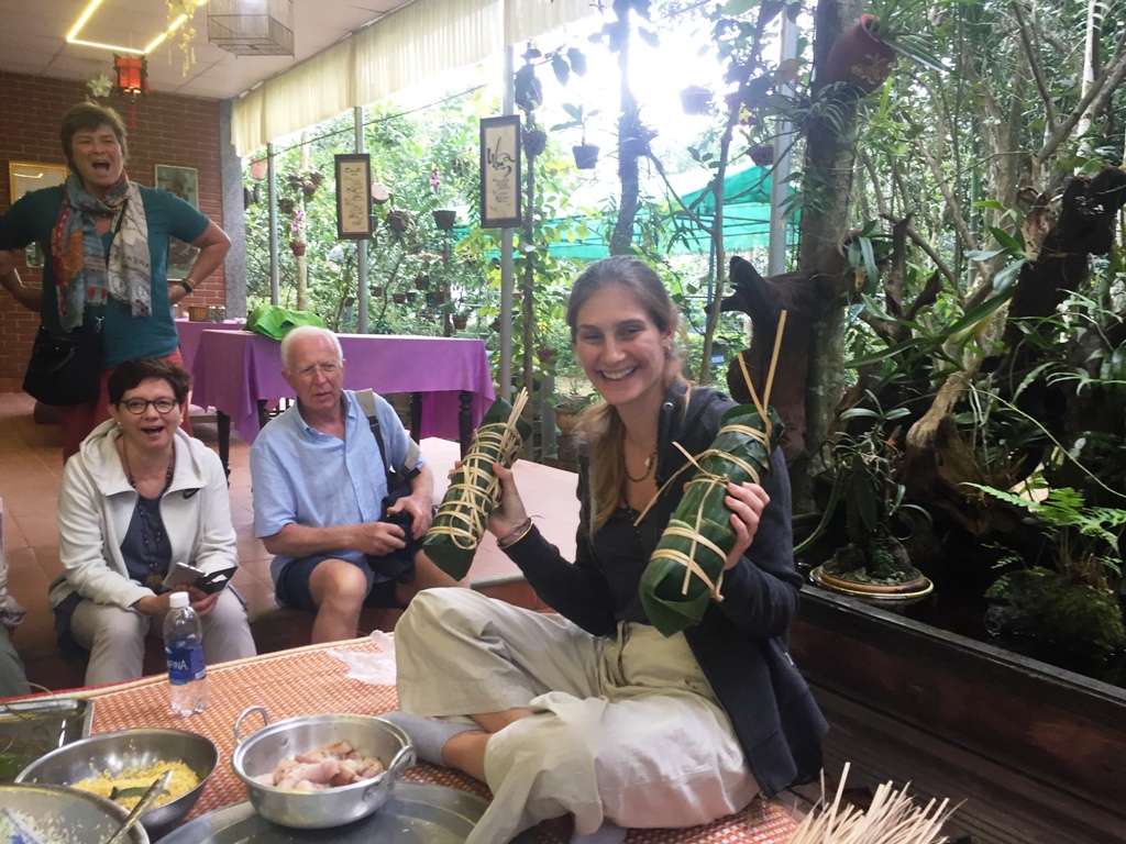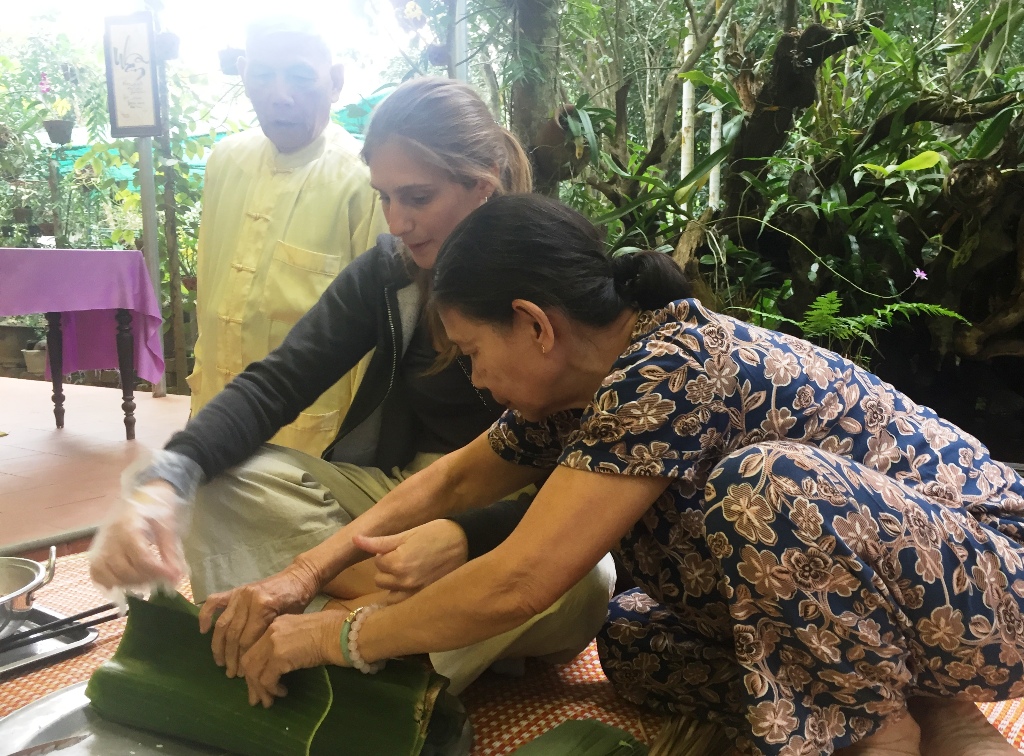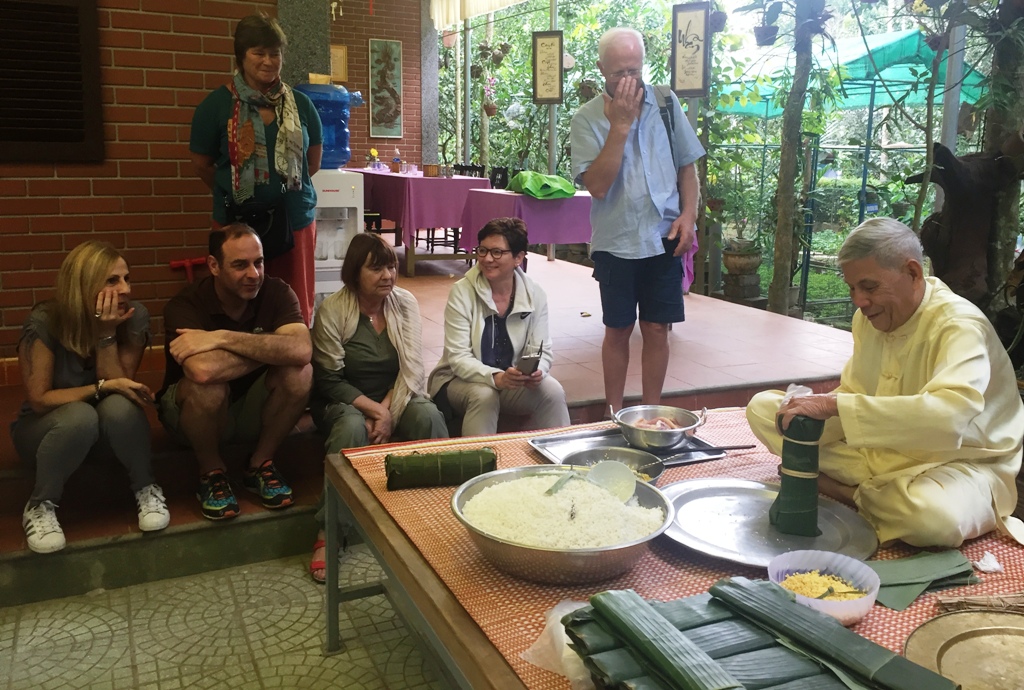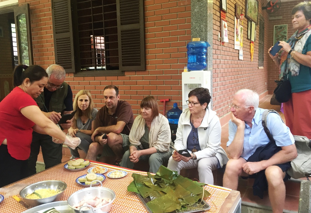 Giới thiệu về lịch sử và ý nghĩa của món bánh xong, ông bắt tay vào gói bánh. 8 du khách người Ý chăm chú dõi theo rồi tự tay thực hành, trải nghiệm gói bánh. Công việc đối với họ rất lạ lẫm và không hề dễ dàng. “Đây là trải nghiệm tuyệt vời. Chúng tôi không chỉ biết đến món bánh truyền thống của các bạn mà còn tự tay làm nó. Ban đầu, công việc này rất khó khăn nhưng khi được ông Đài giúp đỡ, việc gói bánh trở nên dễ dàng hơn”, chị Mageria du khách người Ý chia sẻ.