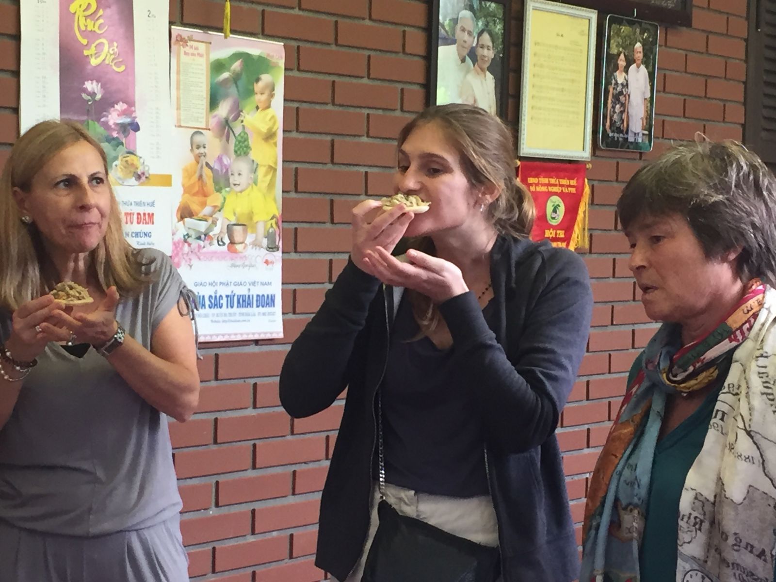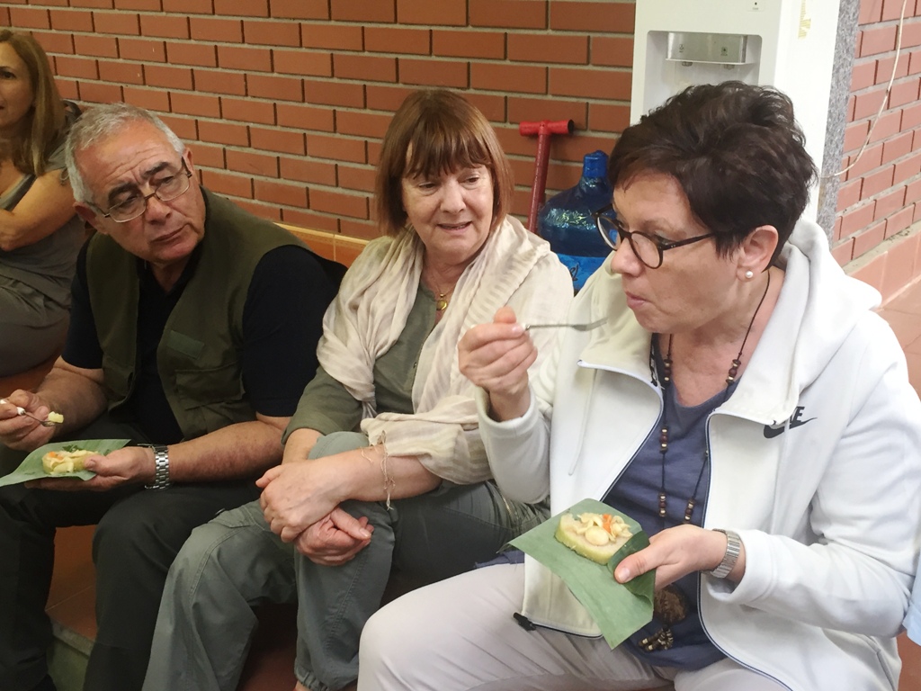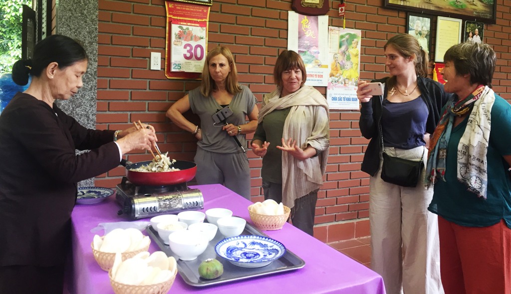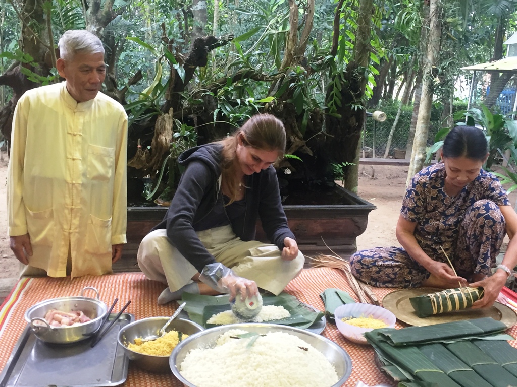 Giới thiệu về lịch sử và ý nghĩa của món bánh xong, ông bắt tay vào gói bánh. 8 du khách người Ý chăm chú dõi theo rồi tự tay thực hành, trải nghiệm gói bánh. Công việc đối với họ rất lạ lẫm và không hề dễ dàng. “Đây là trải nghiệm tuyệt vời. Chúng tôi không chỉ biết đến món bánh truyền thống của các bạn mà còn tự tay làm nó. Ban đầu, công việc này rất khó khăn nhưng khi được ông Đài giúp đỡ, việc gói bánh trở nên dễ dàng hơn”, chị Mageria du khách người Ý chia sẻ.