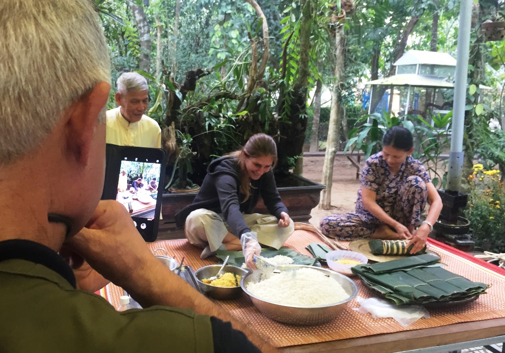 Đây là trải nghiệm được du khách mong đợi nhất. Trước khi thị phạm, ông Đài giới thiệu qua về ý nghĩa món bánh tét đến với du khách. “Đây là loại bánh truyền thống của người Việt chúng tôi, dành dâng cúng ông bà, tổ tiên. Bánh được gọi bằng lá chuối với nguyên liệu là nếp; nhân là đậu xanh, thịt heo. Bánh nấu 12 tiếng mới chín”, ông Đài giới thiệu.
