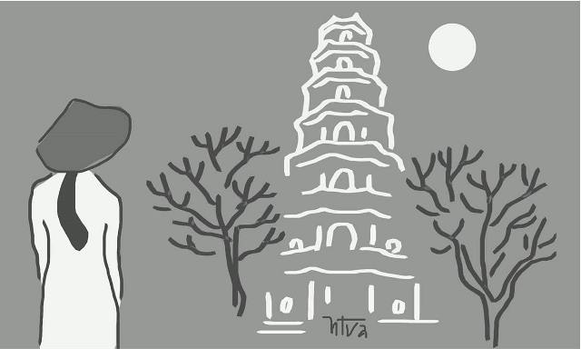 Hoàng hôn chưa kịp tắt, mà vầng trăng đã trôi lơ lửng giữa trời. Đó là khi mình ngồi nơi bến sông trước chùa Thiên Mụ, ngắm mặt trời đỏ rực đang đi dần về bên kia núi. Phía ấy, từng cụm mây trắng muốt như những chiếc bông gòn mềm xốp ngọt lịm, chồng lên nhau, chỉ lơ đãng trong chốc lát mà đã nhuốm màu đỏ rực. Mình ngồi nơi bến sông, mải miết chờ ngày tàn, cho đến khi nhìn thấy vầng trăng lơ lửng giữa trời, đầy cô đơn.