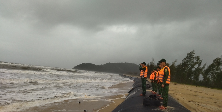 | Lực lượng BĐBP Đồn Biên phòng Vinh Xuân đang tìm kiếm dọc bờ biển |